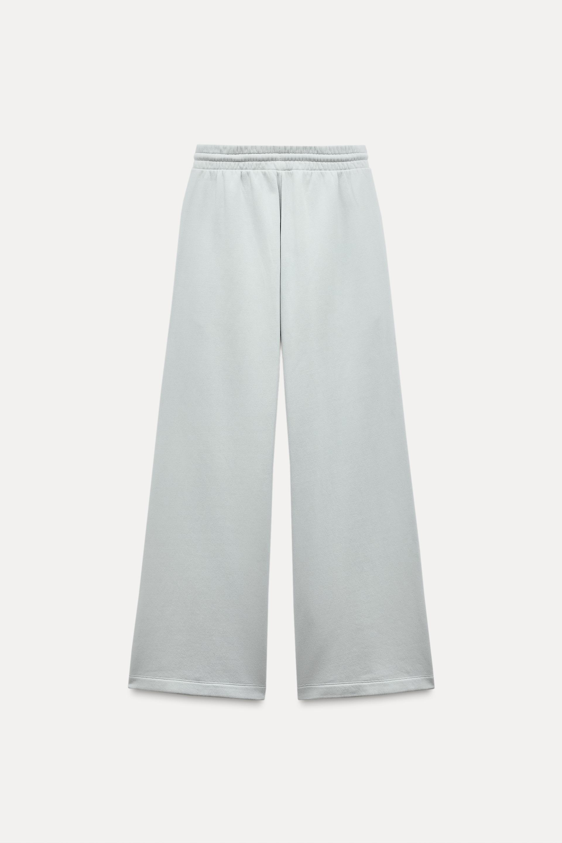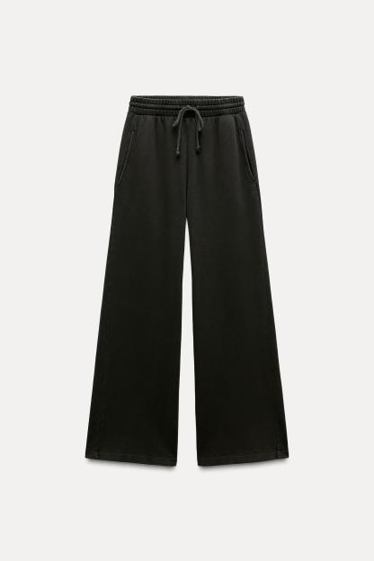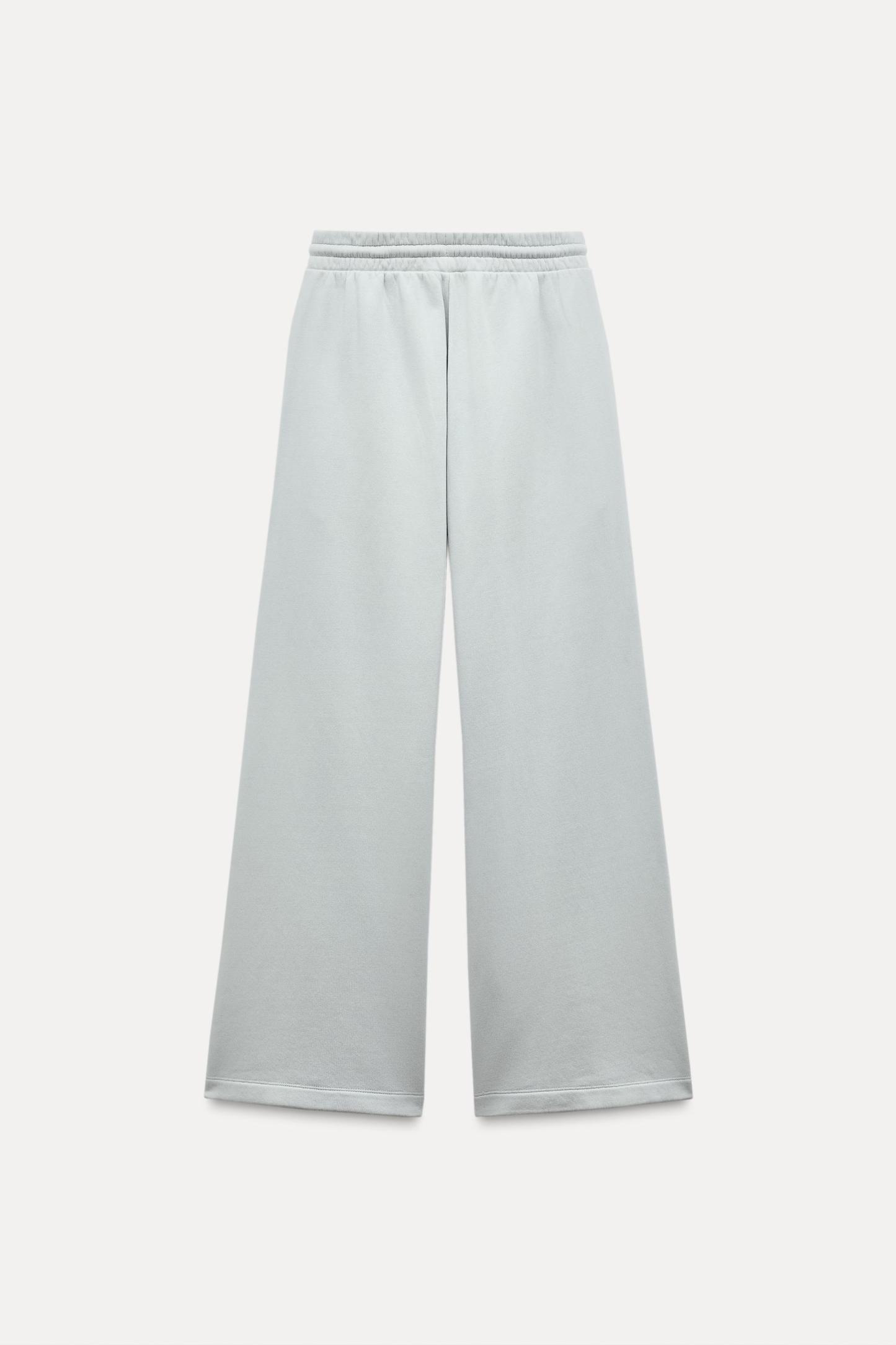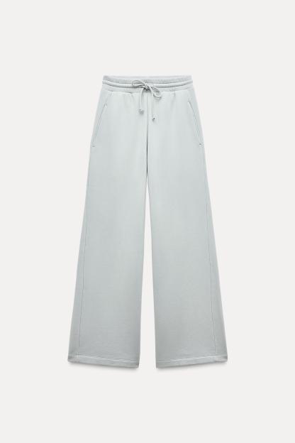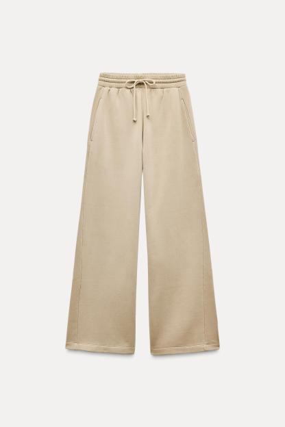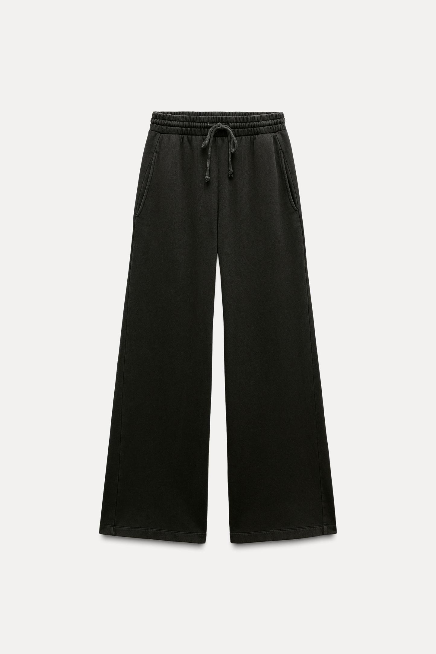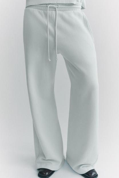 Pants made of a cotton blend. Mid waist and adjustable elastic drawstring waistband. Side pockets. Wide leg.
