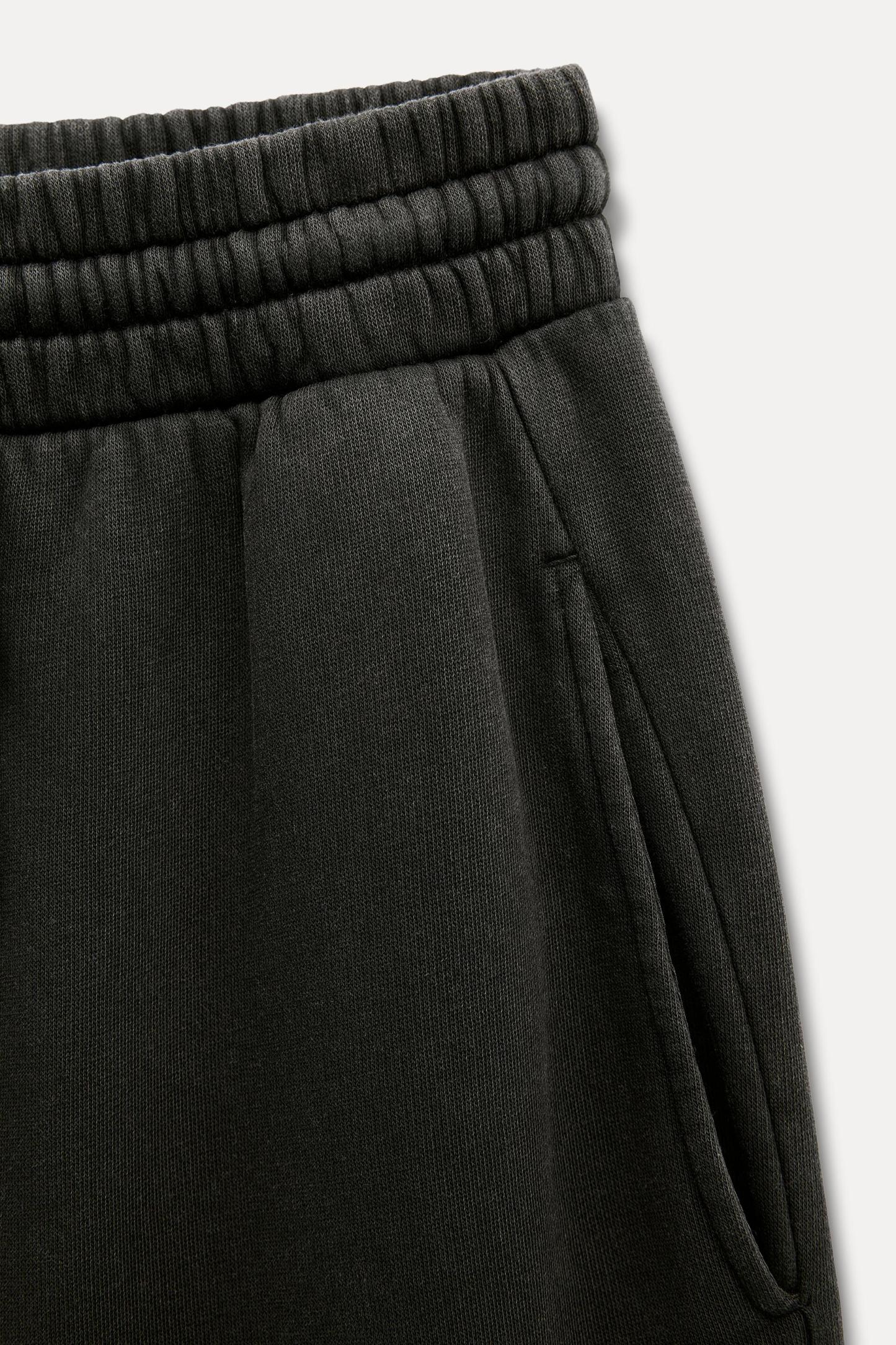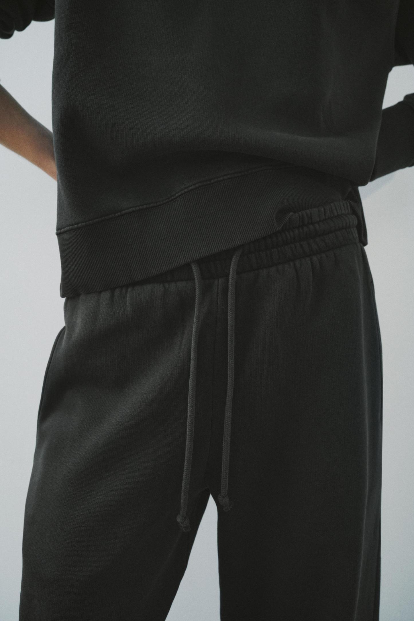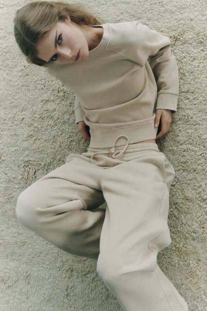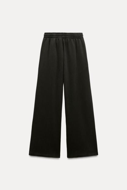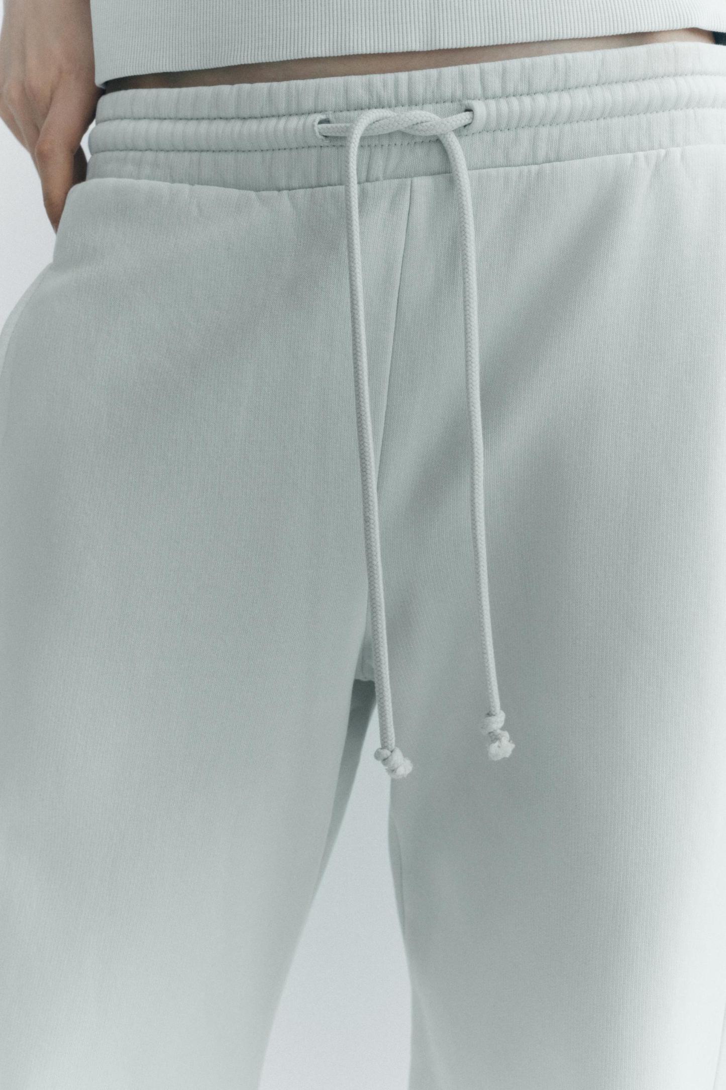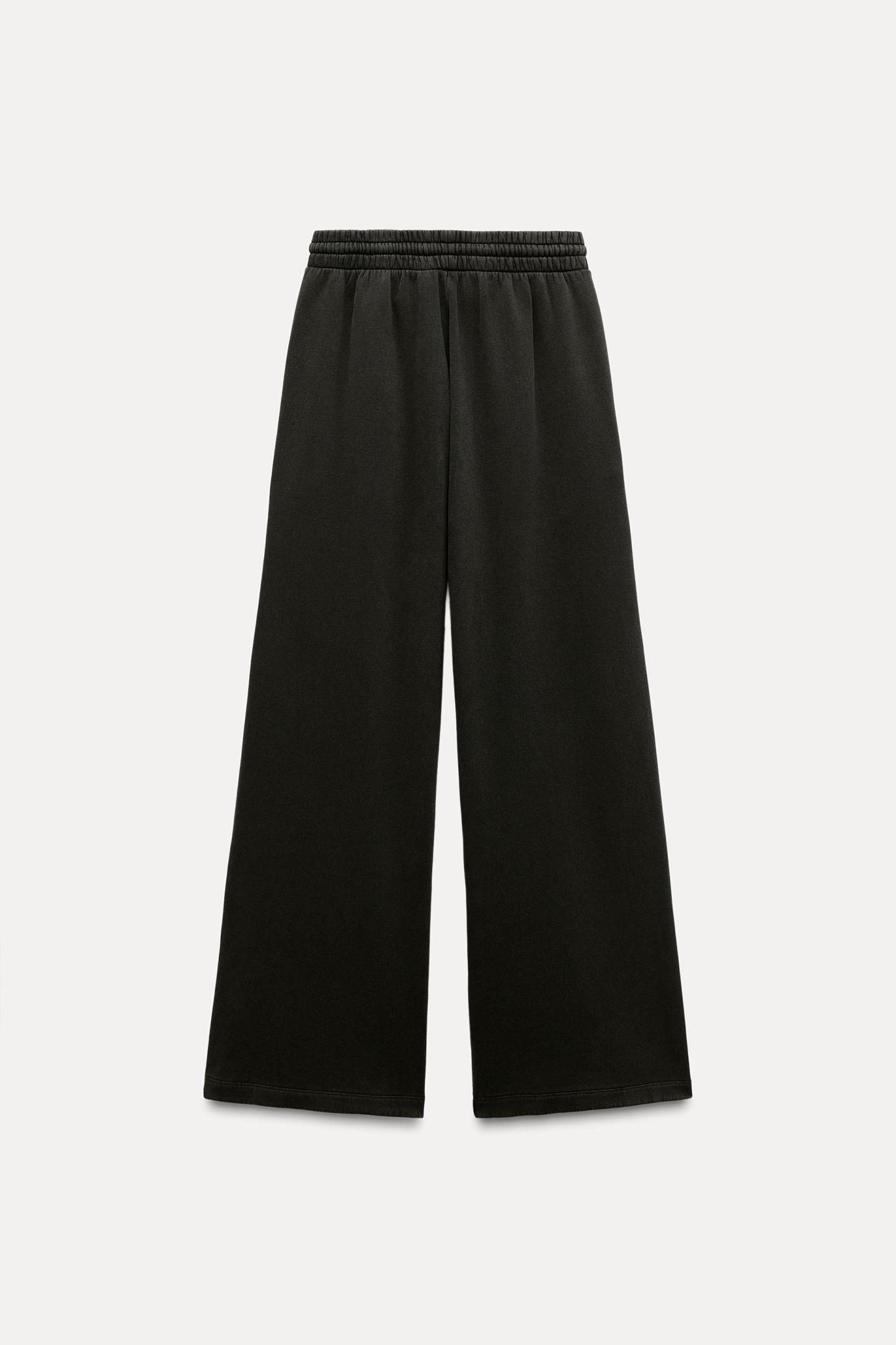 Pants made of a cotton blend. Mid waist and adjustable elastic drawstring waistband. Side pockets. Wide leg.