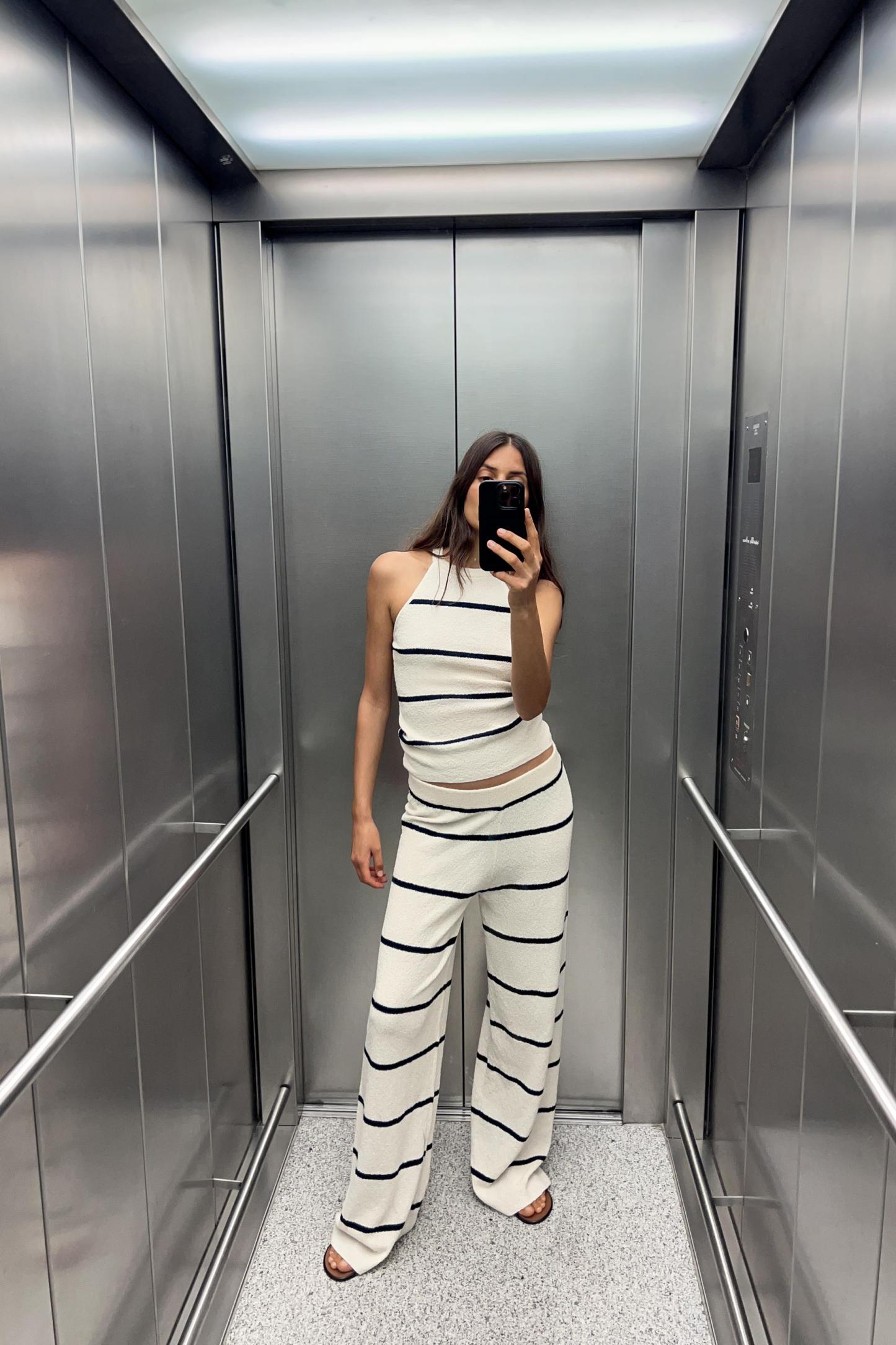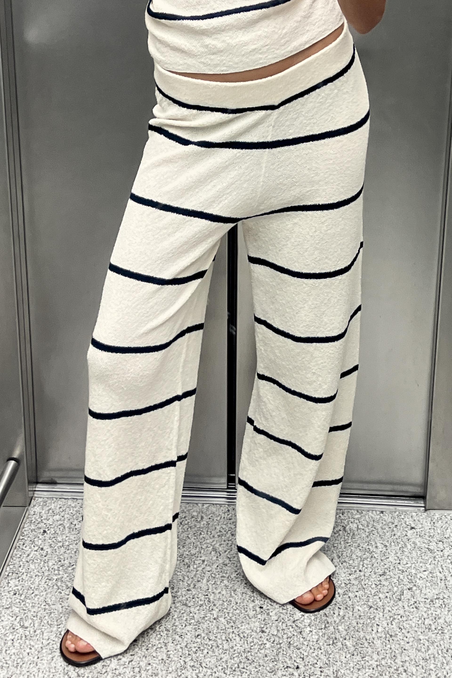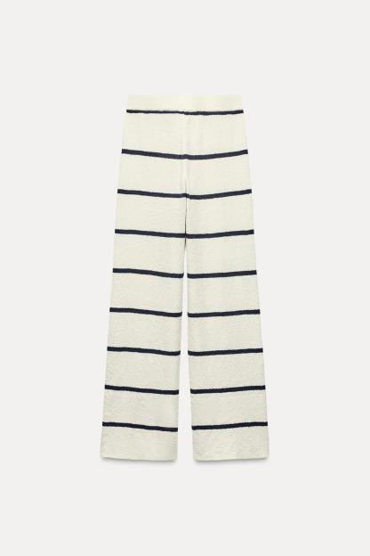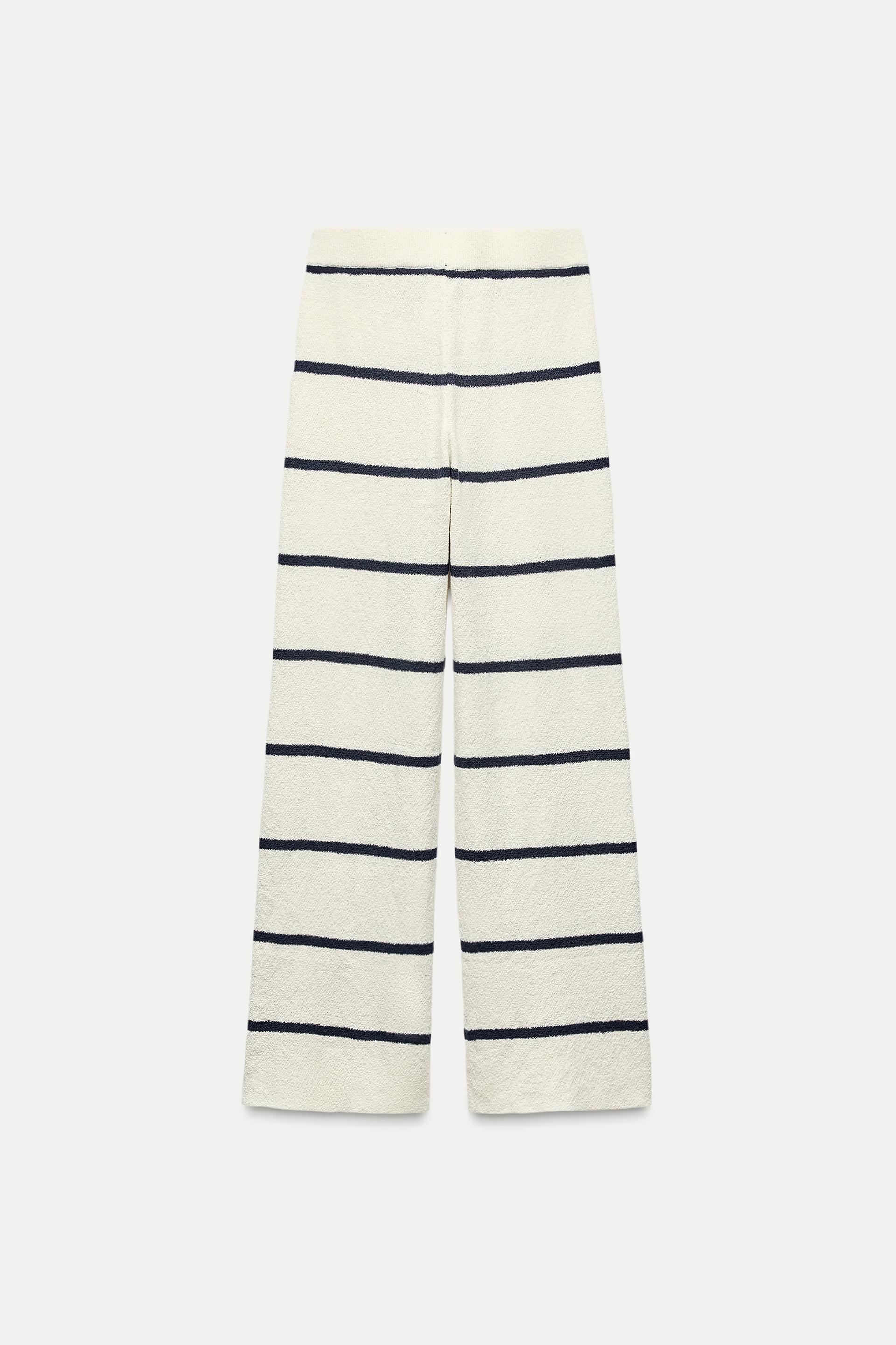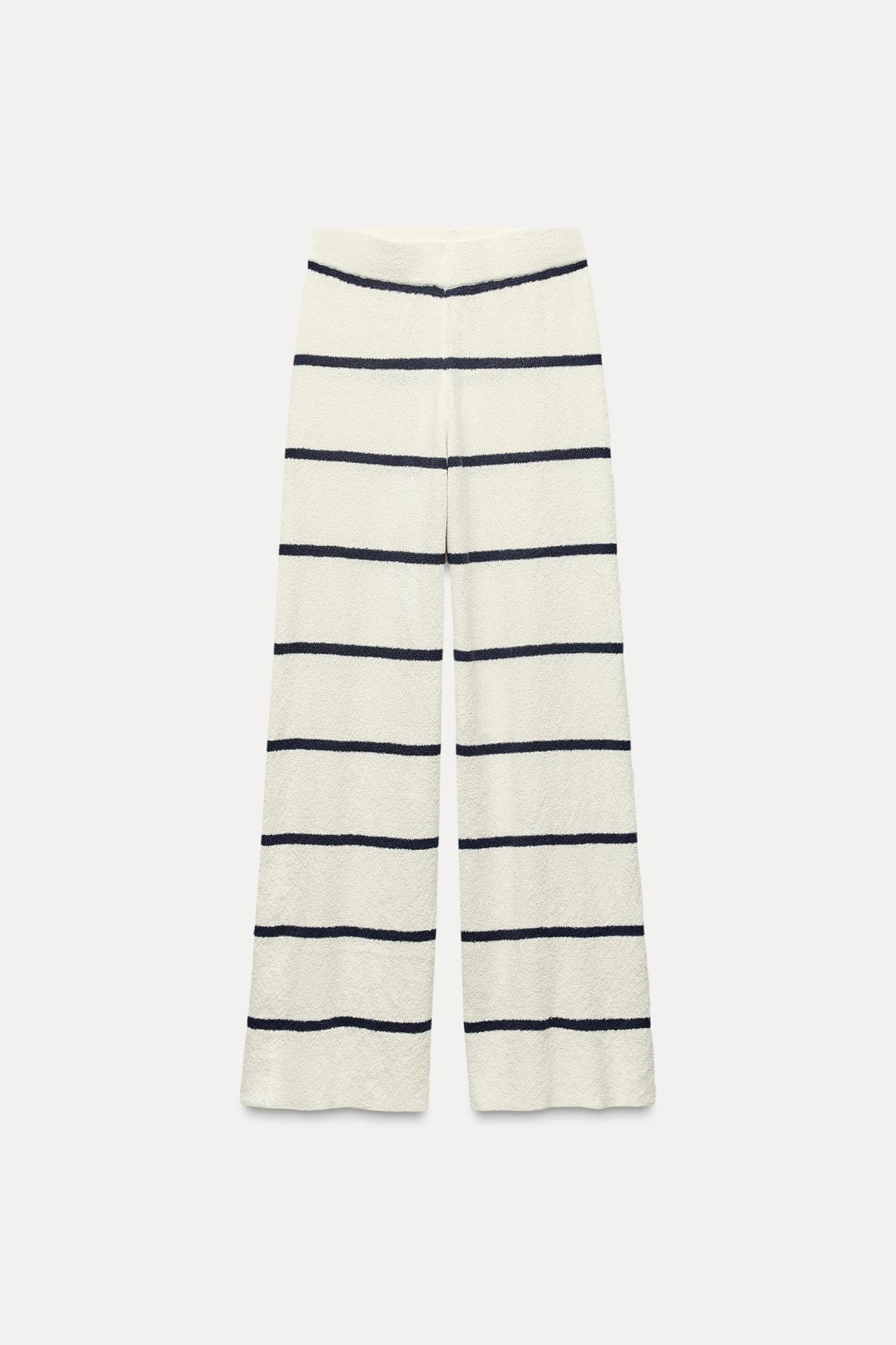 Pants made of knit fabric. High waist elastic waistband. Wide leg.